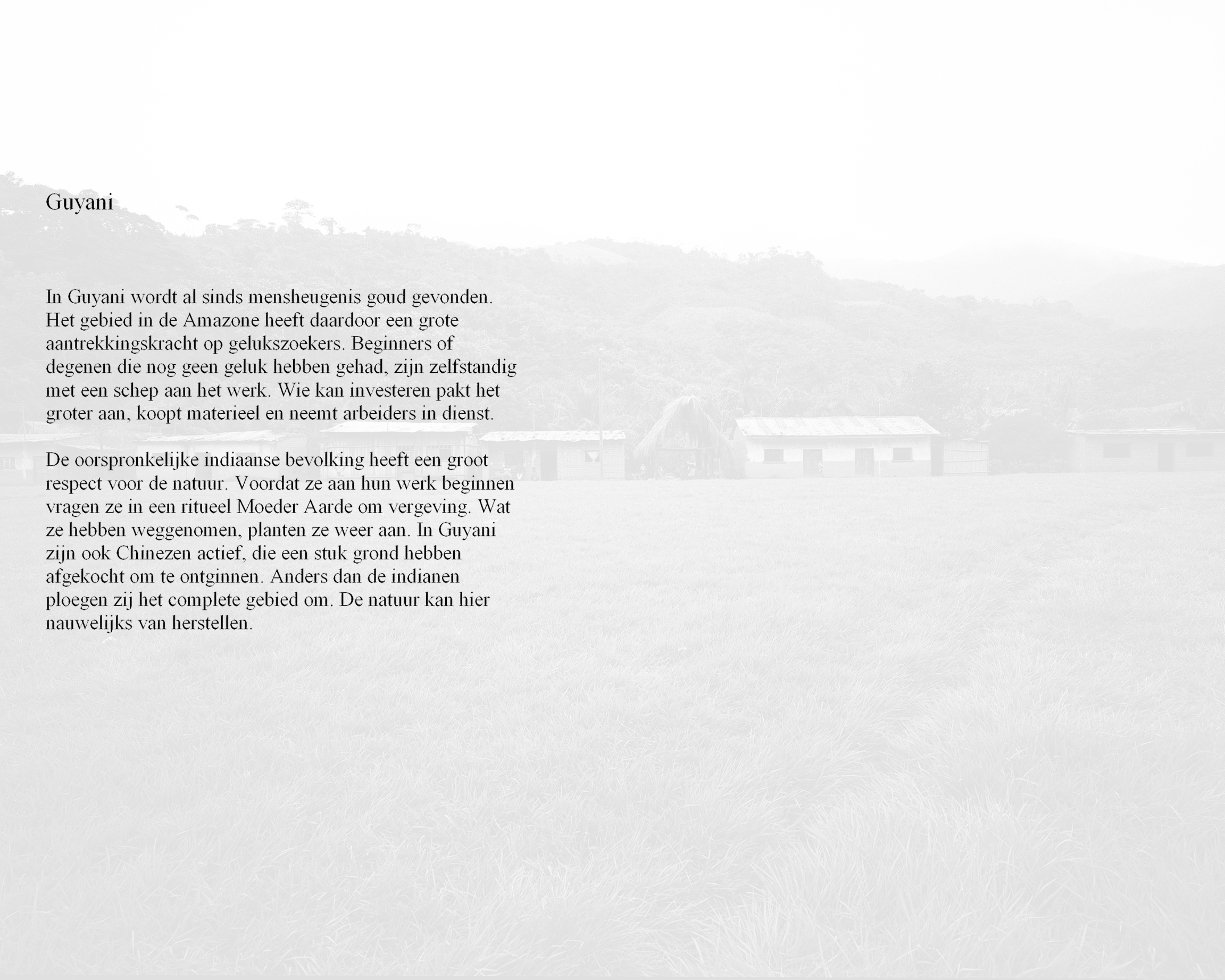 De oorspronkelijke indiaanse bevolking heeft een groot respect voor de natuur. Voordat ze aan hun werk beginnen vragen ze in een ritueel Moeder Aarde om vergeving. Wat ze hebben weggenomen, planten ze weer aan. In Guyani zijn ook Chinezen actief, die een stuk grond hebben afgekocht om te ontginnen. Anders dan de indianen ploegen zij het complete gebied om. De natuur kan hier nauwelijks van herstellen.